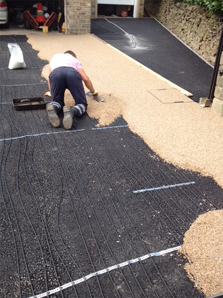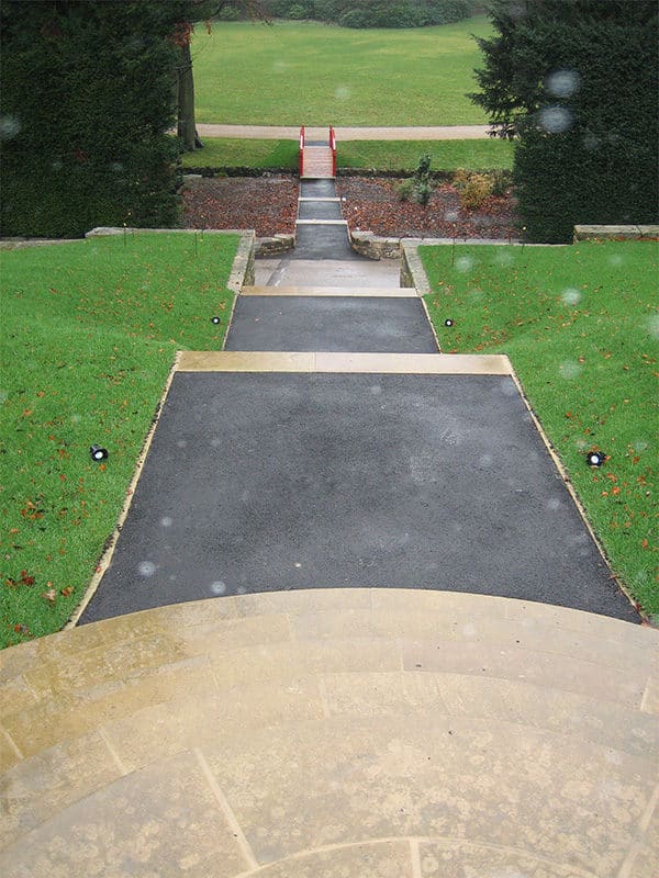 This client wanted a porous good looking, hardwearing resin mixed stone surfacing with the unusual feature of under floor heating. We laid heating cables with an ice detector within the surface. The owner was very impressed with the finished work, shovelling snow for him is a thing of the past!